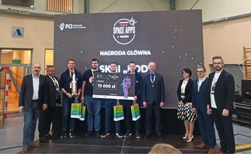 Informacja o wyróżnieniu projektu koła studenckiego SKNI "Kod" w globalnej edycji NASA Space Apps Challenge.
