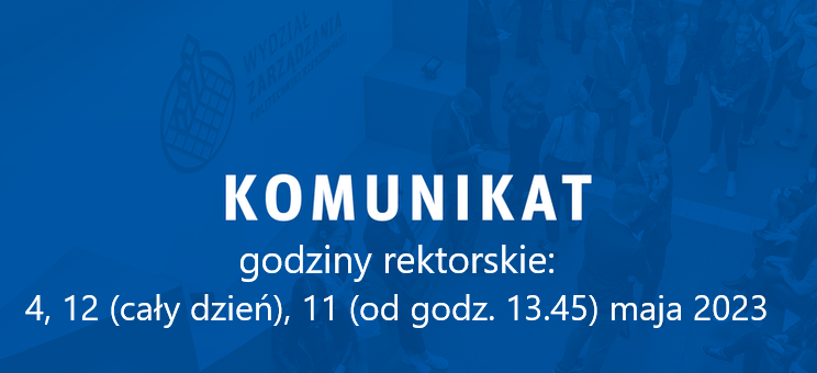 Godziny wolne od zajęć dydaktycznych bez obowiązku odrabiania będą obowiązywały również w dniach 11 maja 2023 r. (od godziny 13.45) oraz 12 maja 2023 r. (cały dzień). Godziny rektorskie w tych dniach zostały ustalone na podstawie Komunikatu Nr 5/2023 Rektora Politechniki Rzeszowskiej im. Ignacego Łukasiewicza z dnia 24 kwietnia 2023 r., w związku organizacją Rzeszowskich Juwenaliów.