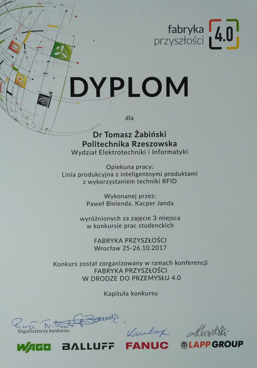 W ramach konkursu oceniano pomysł na pracę dyplomową demonstrującą elementy idei Przemysłu 4.0 (Industry 4.0). Opiekunem zgłoszonej pracy jest dr inż. Tomasz Żabiński.
