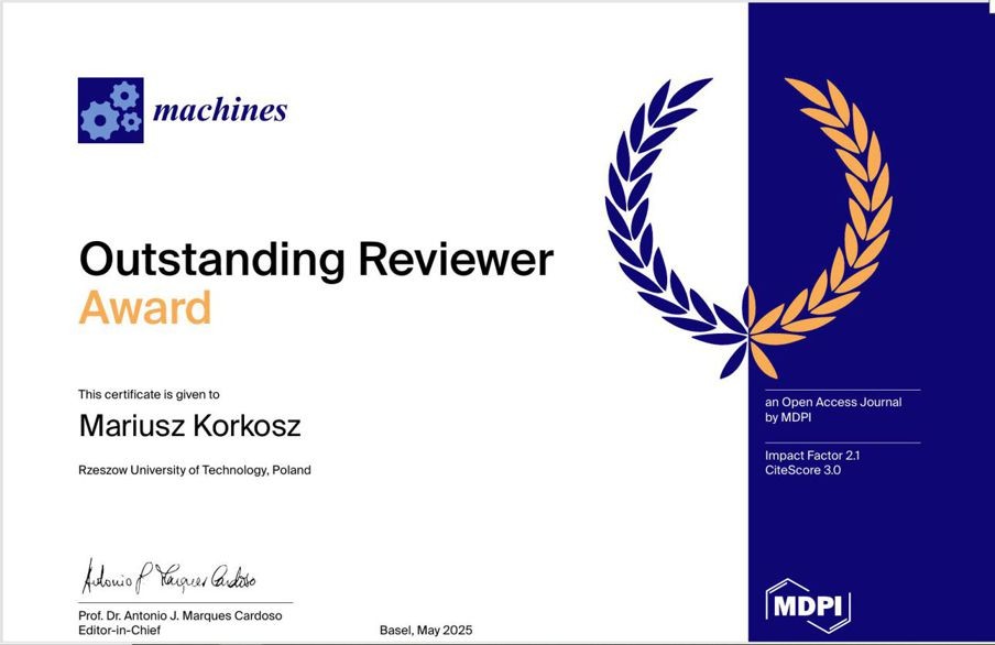Kierownik Zakładu Elektrodynamiki i Systemów Elektromaszynowych (ZEiSE) dr hab. inż. Mariusz Korkosz, prof. PRz otrzymał nagrodę "Outstanding Reviewer" za cykl recenzji dla czasopisma "Machines" (Impact Factor = 2.1) z konsorcjum MDPI. Dr hab. inż. Mariusz Korkosz, prof. PRz jest wybitnym specjalistą z tematyki projektowania nowoczesnych maszyn elektrycznych (SRM, BLDC, PMSM), wykorzystującym narzędzia modeli polowych oraz modeli obwodowych.