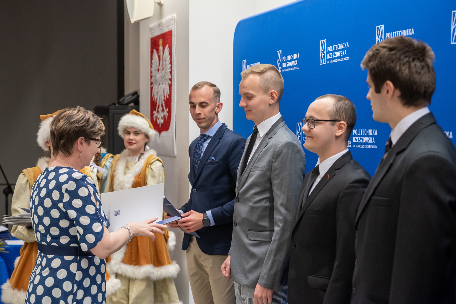 Uroczystość rozpoczęła się miłym artystycznym akcentem, jakim był występem wokalny dwóch wyróżnionych studentek z Wydziału Matematyki i Fizyki Stosowanej. Następnie prorektor ds. kształcenia dr hab. Iwona Włoch, prof. PRz i prorektor ds. studenckich prof. dr hab. Grzegorz Ostasz wręczyli nagrody i lity gratulacyjne studentom.