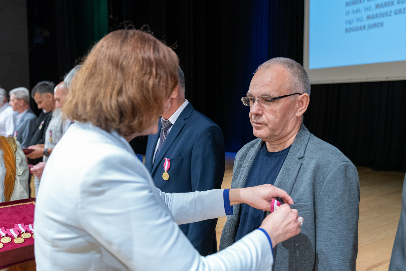 Medale srebrne i brązowe pracownikom Politechniki Rzeszowskiej wręczyła wojewoda podkarpacki Ewa Leniart w towarzystwie prorektora ds. studenckich prof. dr. hab. Grzegorza Ostasza.