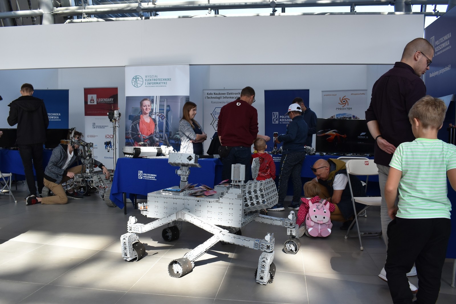 Podczas kolejnej edycji Podkarpackiego Festiwalu Nauki odbywającego się w G2A Arena w Jasionce w dniach 20-21 września br. można było zobaczyć strefę przygotowaną przez Politechnikę Rzeszowską. Na stanowisku informacyjnym Uczelni można było zaznajomić się z Wydziałami i kierunkami na jakich Uczelnia kształci studentów. W strefach Kół Naukowych uczestnicy mogli doświadczyć niesamowitych pokazów chemicznych przygotowanych przez Koło Naukowe ESPRIT, pooglądać rzeszowskiego Bolida Formuły Student, posterować łazikiem marsjańskim zespołu Legendary oraz porozmawiać o wydrukach 3D na stanowisku Koła Szybkiego Prototypowania i Wzornictwa Przemysłowego. W strefie naukowej nie mogło zabraknąć reprezentantów naszego Wydziału. Swoje projekty przedstawiali studenci Koła Naukowego Elektroniki i Technologii Informacyjnych. Każdy odwiedzający mógł poznać konstrukcje zbudowane przez studentów, zobaczyć roboty biorące udział w wielu zawodach w Polsce, a przede wszystkim poznać tajniki elektroniki i robotyki od przyjaznej, rozrywkowej strony. Uczestnicy dowiedzieli się jak działają czujniki podczerwieni, żyroskop i akcelerometr, jak robot może wykryć kolory i jak to się dzieje że robot kogoś „widzi”.