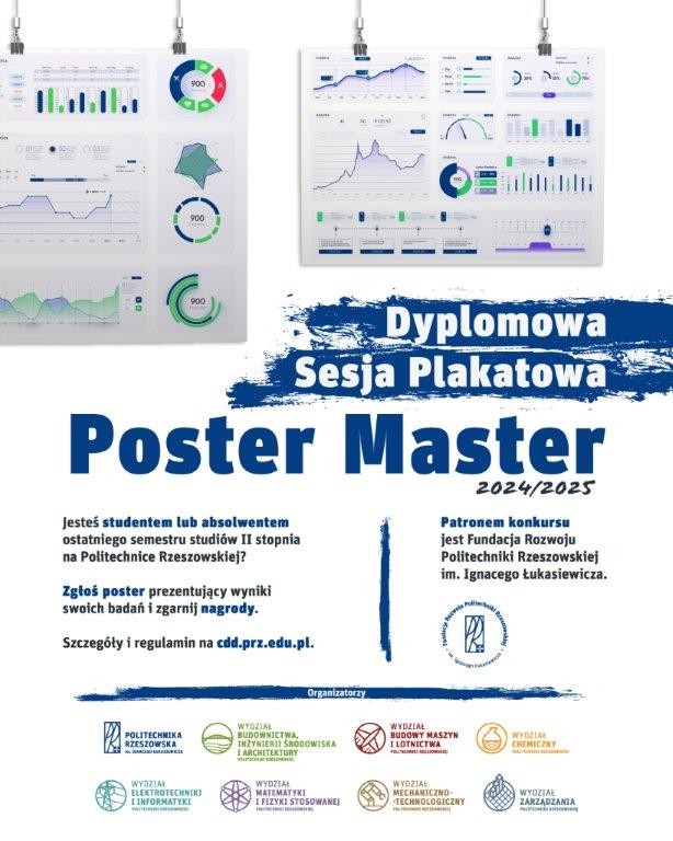 Konkurs POSTER MASTER to wydarzenie mające na celu prezentację wyników badań uzyskanych przez studentów podczas realizacji prac dyplomowych magisterskich w danym roku akademickim. Prezentacje posterów z prac dyplomowych podlegają ocenie i najlepsze z nich zostają nagrodzone. Szczegóły konkursu znajdują