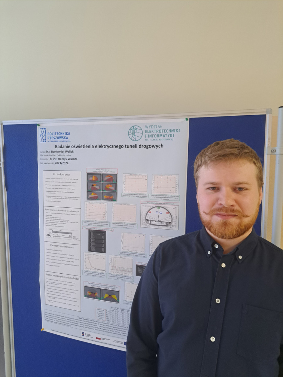 - Ostatnim nagrodzonym w konkursie za zajęcie czwartego miejsca został inż. Bartłomiej Walicki, student kierunku Elektrotechnika za pracę pt. „Badanie oświetlenia elektrycznego tuneli drogowych”, której promotorem był dr hab. inż. Henryk Wachta.