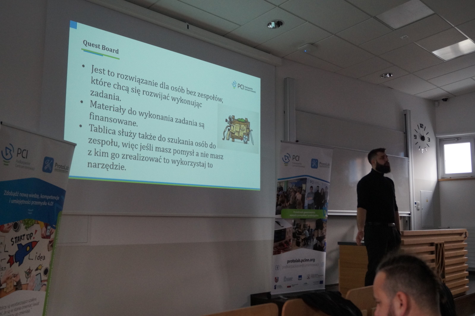 Na spotkaniu Bartosz Jadam Dyrektor Zarządzający ProtoLab opowiedział o istotcie działania Protolab. Natomiast Karol Kibałko - Koordynator Animatorów i przestrzeni ProtoLab interesująco przedstawił możliwości współpracy dla studentów i przedstawicieli kół naukowych. Omówione zostało pięć ścieżek do realizacji nowych projektów i przedsięwzięć, a także darmowe pracownie dostępne w ProtoLAB, w których studenci mogą tworzyć własne projekty.