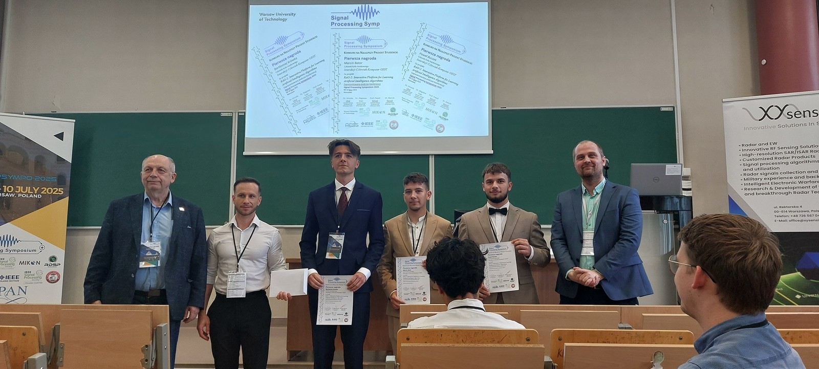 Signal Processing Symposium (SPSympo) zainicjowane w 2003 roku przez prof. Krzysztofa Kulpę od ponad 20 lat stanowi platformę wymiany wiedzy wśród naukowców, praktyków z przemysłu oraz doktorantów z całego świata zajmujących się szeroko rozumianym przetwarzaniem sygnałów. W czasie tegorocznych edycji organizowanej w Instytucie Systemów Elektronicznych na Politechnice Warszawskiej przedstawione zostały prace dotyczące między innymi: śledzenia obiektów, analizy fal radiowych, wibroakustyki, technik modelowania kształtu fal oraz wykorzystania różnorakich metod uczenia maszynowego i algorytmów sztucznej inteligencji w przetwarzaniu zbieranych sygnałów. Podczas konferencji zrealizowano również szereg warsztatów, skierowanych głównie do studentów, obejmujących tematykę pasywnych radarów powietrznych, zagadnień programistycznych oraz metod analizy wzorców przestrzennych i czasowych. Dodatkowo organizatorzy przygotowali również konkurs, skierowany do studenckich kół naukowych, na najlepszy projekt studencki dotyczący szeroko rozumianego przetwarzania sygnałów. Zespół studentów 3-go roku Informatyki w składzie: Marcin Bator, Paweł Buczek oraz Bartłomiej Krówka, reprezentujący koło naukowe Interakcji Człowiek-Komputer GEST (link do strony koła) działające przy Katedrze Informatyki i Automatyki, decyzją komisji konkursowej zakwalifikował się do finału konkursu. Podczas finału zespół koła GEST pokonał koła naukowe z Politechniki Wrocławskiej oraz Politechniki Poznańskiej zajmując tym samym I miejsce.