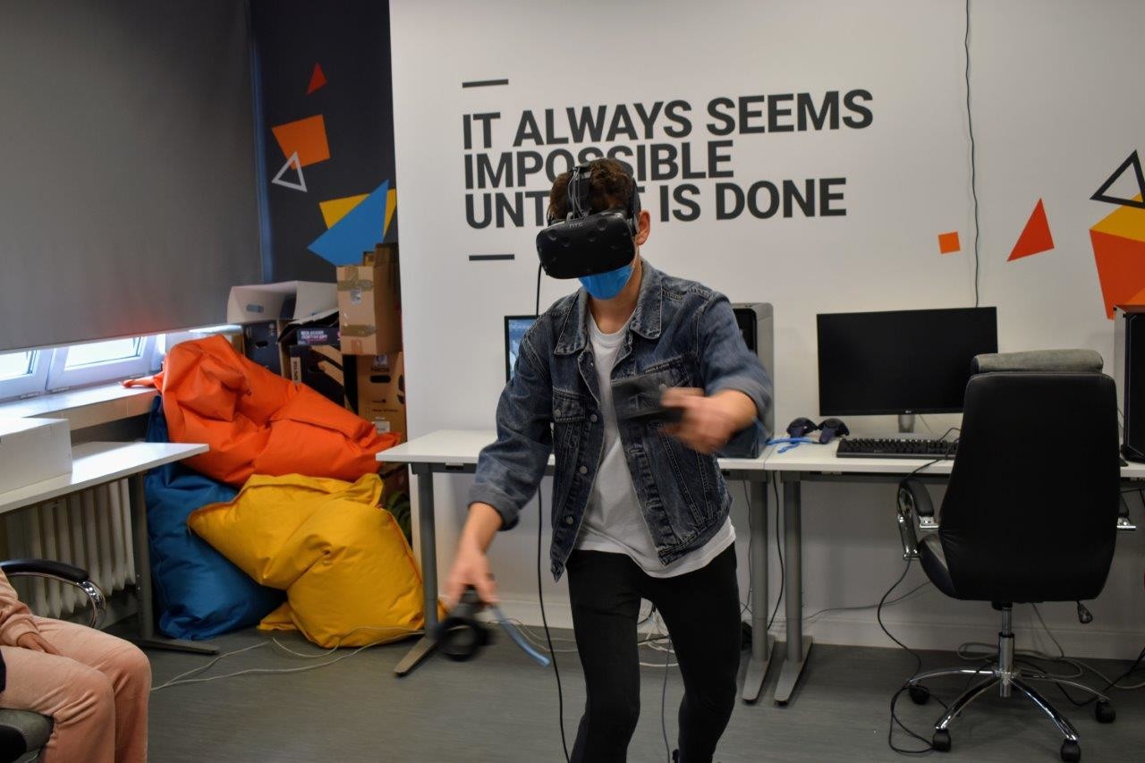 - Laboratorium Wirtualnej Rzeczywistości (A59) w Zakładzie Systemów Złożonych prezentował mgr inż. Bartosz Kowal.