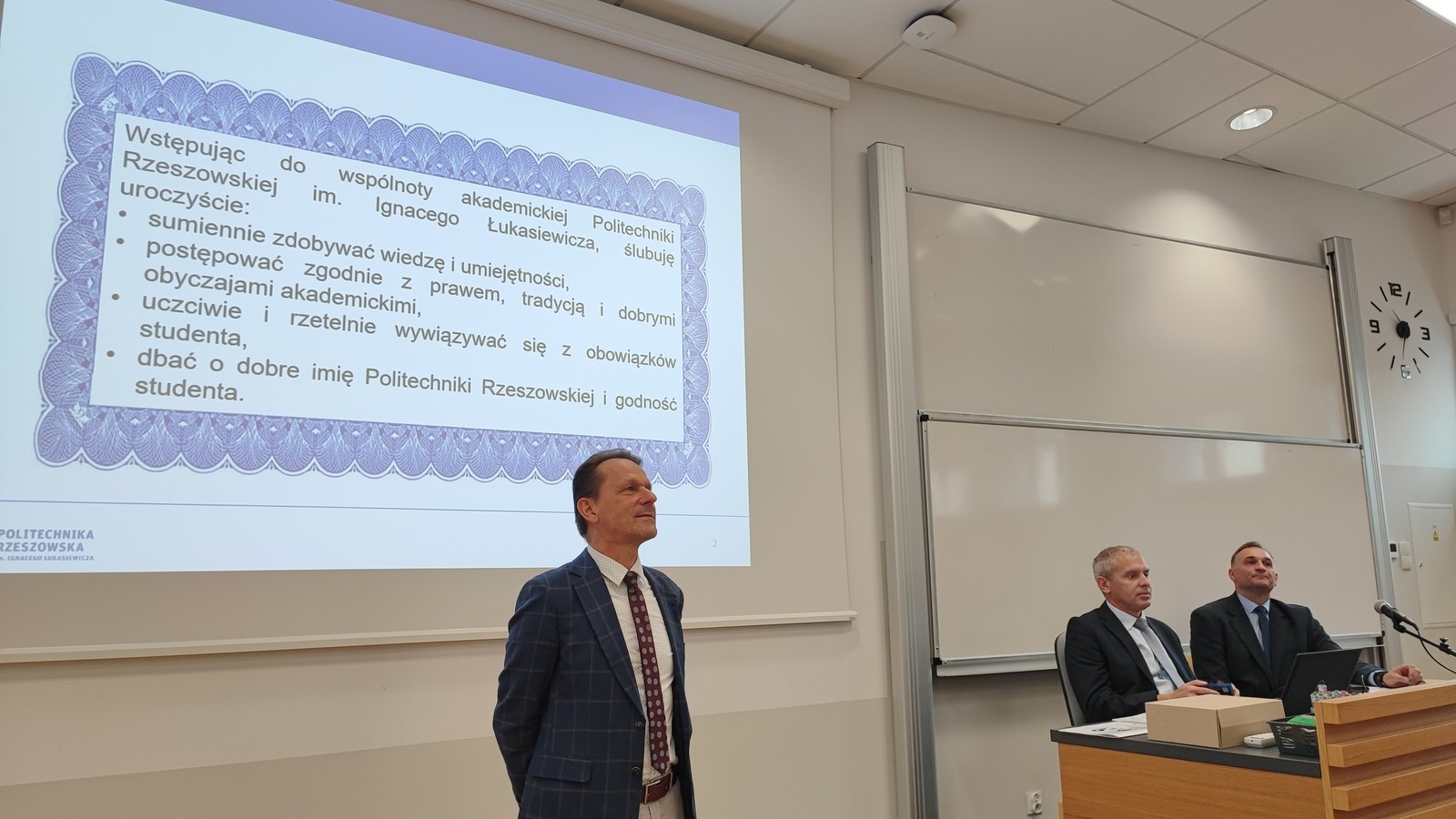 Studentów przywitali dziekan Wydziału Elektrotechniki i Informatyki, dr hab. inż. Roman Zajdel, prof. PRz oraz prodziekani ds. kształcenia, dr inż. Mazurek i dr inż. Mariusz Trojnar, przed którymi złożyli oni ślubowanie, będące aktem nabycia praw studenta.