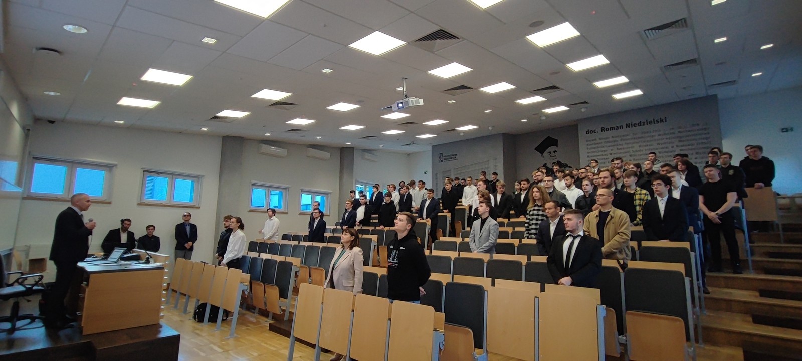 Studentów przywitali dziekan Wydziału Elektrotechniki i Informatyki, dr hab. inż. Roman Zajdel, prof. PRz oraz prodziekani ds. kształcenia, dr inż. Mazurek i dr inż. Mariusz Trojnar, przed którymi złożyli oni ślubowanie, będące aktem nabycia praw studenta..
