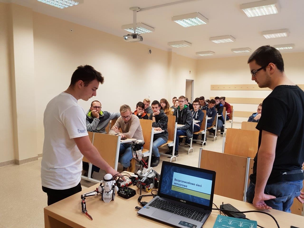 Podczas dwugodzinnego spotkania, dr inż. Paweł Dymora przedstawił ofertę edukacyjną Wydziału i Uczelni, natomiast mgr inż. Bartosz Kowal przedstawił prezentację na temat zagadnień związanych z projektowaniem i testowaniem bezprzewodowych sieci sensorowych.