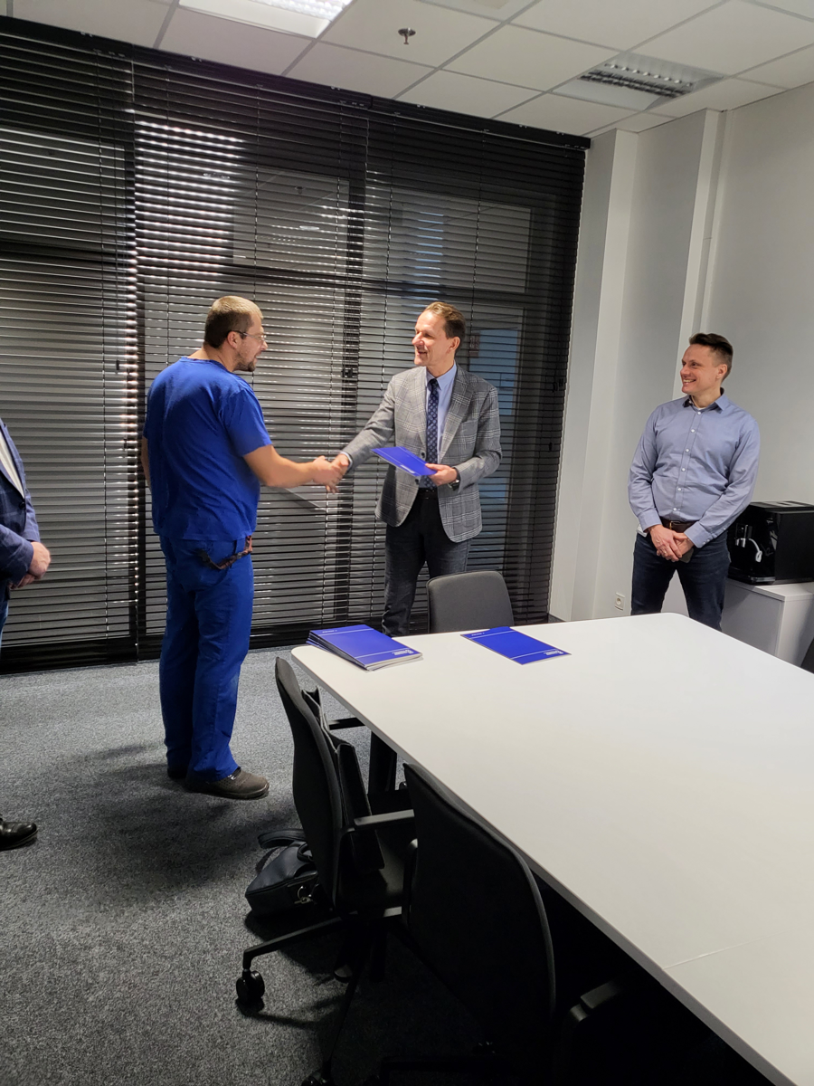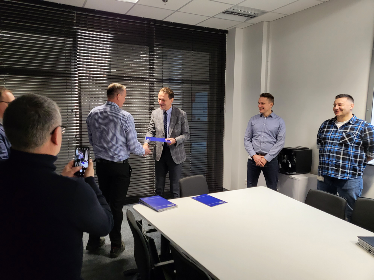 W dniu 20.12.2023 spotkali się przedstawiciele Wydziału Elektrotechniki i Informatyki Politechniki Rzeszowskiej z przedstawicielami firmy BorgWarner. Spotkanie miało na celu wręczenie pracownikom firmy BorgWarner zaświadczeń ukończenia II edycji kursu „Metrologia elektryczna i napędy elektryczne” prowadzonego na Wydziale Elektrotechniki i Informatyki Politechniki Rzeszowskiej w dniach 29.09.2023 – 2.12.2023 r. oraz omówienie dalszej współpracy pomiędzy WEiI, a BorgWarner. Spotkanie odbyło się w siedzibie firmy BorgWarner. Zaświadczenia wręczał Pan Dziekan WEiI dr hab. inż. Roman Zajdel, prof. PRz. Ze strony BorgWarner oprócz uczestników kursu w spotkaniu brali udział Panowie: Arkadiusz Wawrzyniak, Michał Sosnówka i Bartłomiej Bąk, a ze strony PRz oprócz Pana Dziekana, dr hab. inż. Piotr Bogusz, prof. PRz, dr hab. inż. Mariusz Korkosz, prof. PRz oraz dr hab. inż. Mariusz Węglarski, prof. PRz którzy omawiali dalsze kierunki współpracy BorgWarner i WEiI. Pracownicy WEiI mieli możliwość zapoznania się z pracami badawczymi firmy BorgWarner.