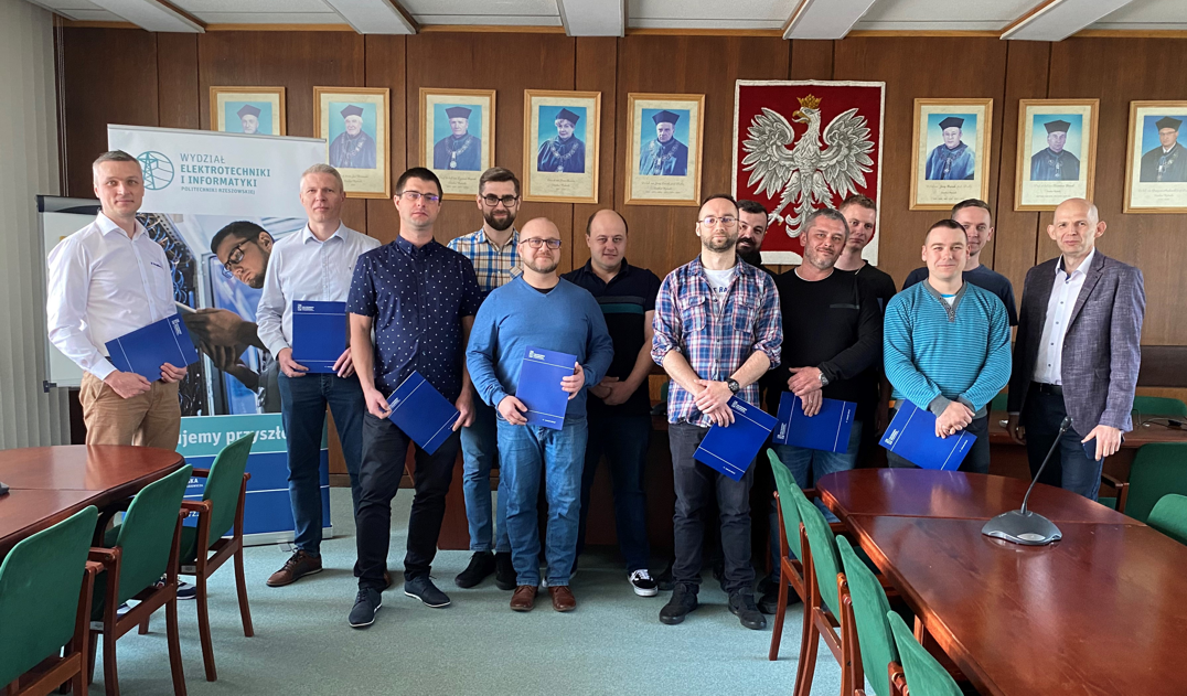 W roku akademickim 2022/2023 na Wydziale Elektrotechniki i Informatyki Politechniki Rzeszowskiej odbyły się dwie edycje kursów szkoleniowych dla Pracowników firmy BorgWarner. I edycja rozpoczęła się we wrześniu 2022 roku i dotyczyła zagadnień metrologii elektrycznej i napędów elektrycznych. W ramach kursu prowadzone były wykłady oraz zajęcia praktyczne realizowane w laboratoriach Katedry Metrologii i Systemów Diagnostycznych oraz Zakładu Elektrodynamiki i Systemów Elektromaszynowych Wydziału Elektrotechniki i Informatyki. II edycja kursu dla tej samej grupy Słuchaczy rozpoczęła się w marcu 2023 roku i dotyczyła zagadnień podstaw techniki mikroprocesorowej, w szczególności systemów wbudowanych oraz standardu wymiany danych CAN (Controller Area Network). Ta edycja kursu prowadzona była przez pracowników Katedry Systemów Elektronicznych i Telekomunikacyjnych Wydziału Elektrotechniki i Informatyki Politechniki Rzeszowskiej. Ukończenie każdej edycji kursu kończyło się otrzymaniem przez Słuchaczy zaświadczeń zawierających informacje o zakresach tematycznych zrealizowanych szkoleń. Na zakończenie I etapu współpracy odbyły się dwa uroczyste spotkania pracowników firmy BorgWarner oraz Wydziału Elektrotechniki i Informatyki Politechniki Rzeszowskiej, na których wręczono zaświadczenia ukończenia kursu oraz podsumowano dotychczasową współpracę. Miło nam było gościć Pracowników firmy BorgWarner w murach naszego Wydziału i mamy nadzieję na dalszą współpracę.