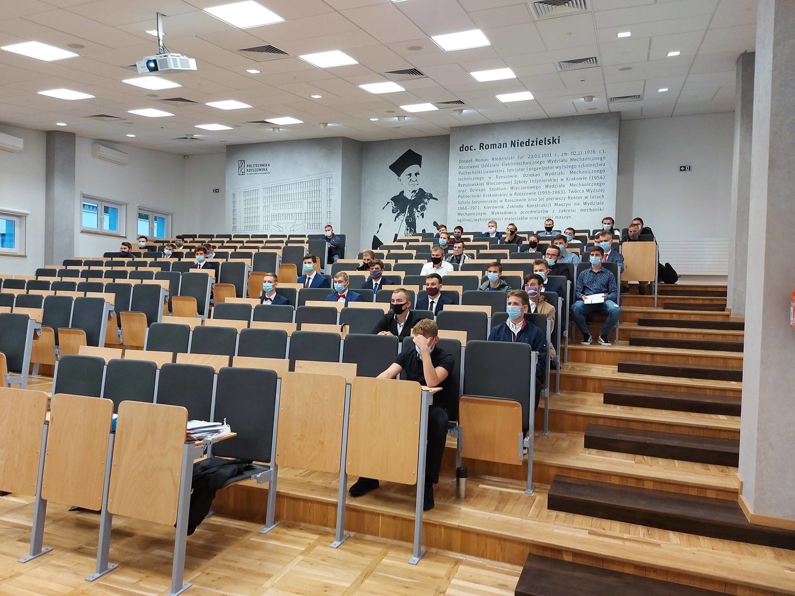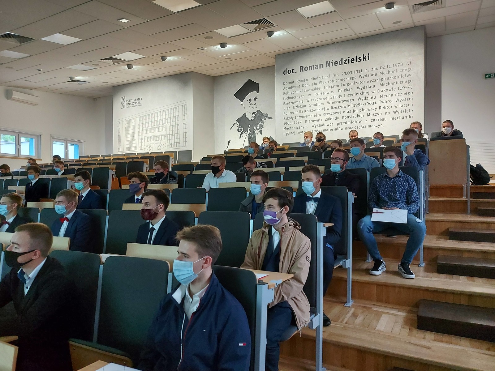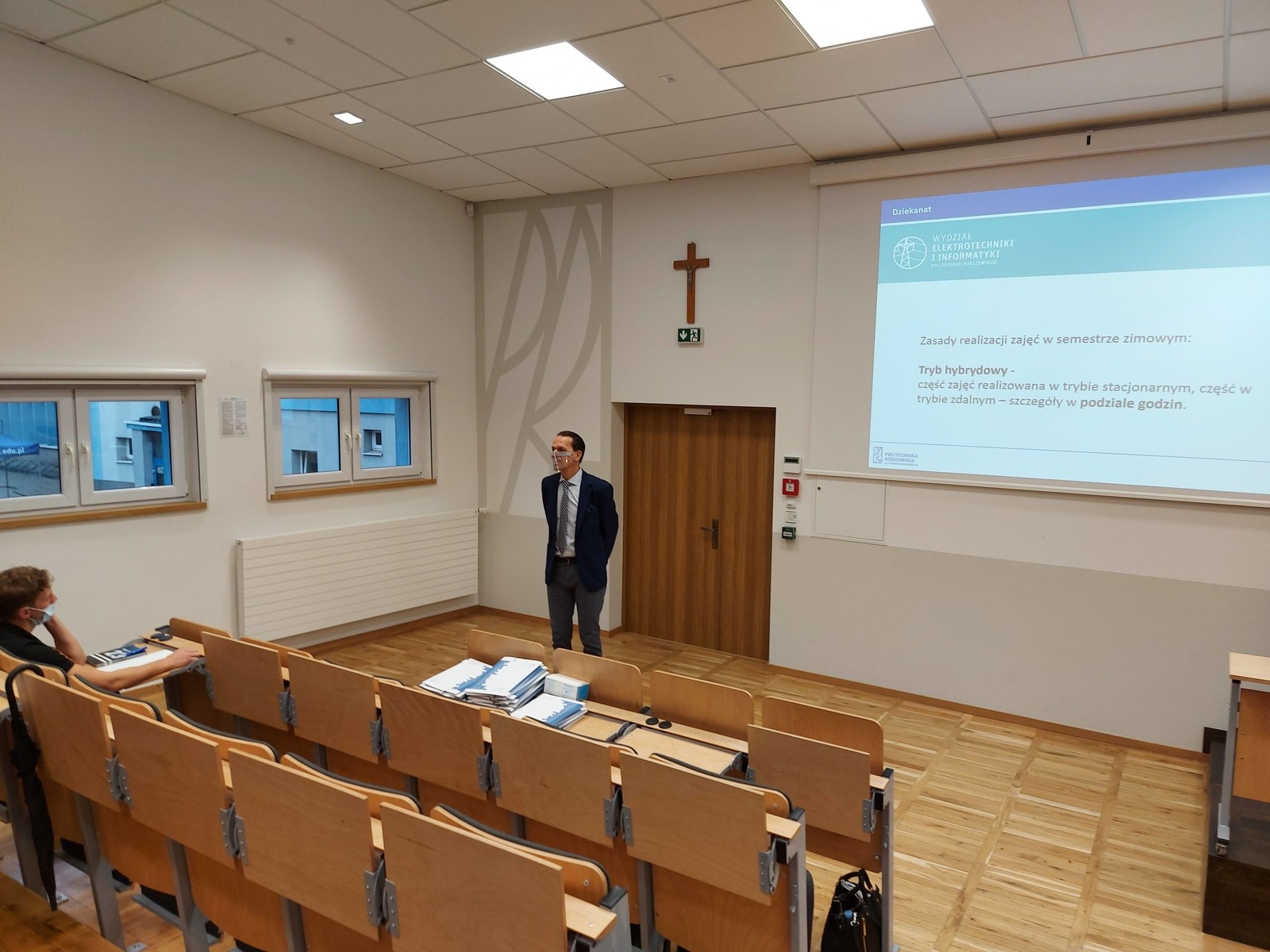 Dziekan Wydziału Elektrotechniki i Informatyki dr. hab. inż. Roman Zajdel, prof. PRz wraz z Prodziekanami ds. Kształcenia dr. inż. Mirosławem Mazurkiem i dr. inż. Witoldem Posiewałą oraz przedstawicielami Samorządu Studenckiego przywitali nowych studentów.