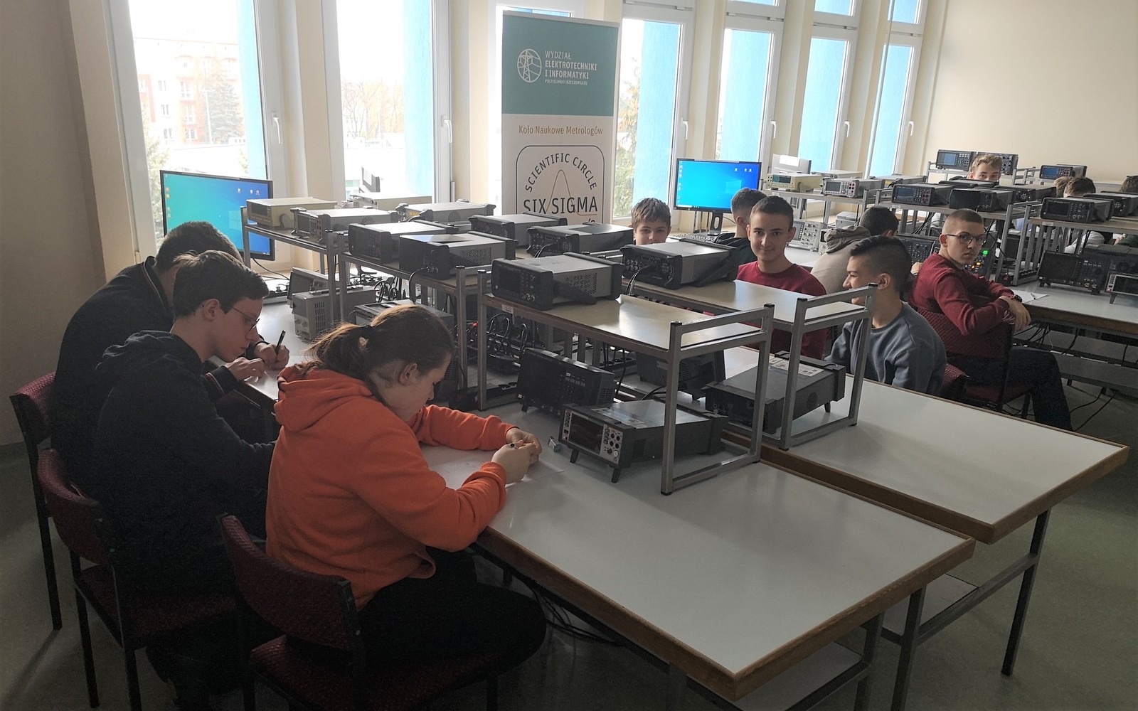 W dniu 24 lutego 2023 odbyły się kolejne zajęcia w ramach zadania „Politechniczna Sieć Via Carpatia im. Prezydenta RP Lecha Kaczyńskiego” (Działanie 1 „Z technikum na politechniki”). W zajęciach uczestniczyli uczniowie klas pierwszych Zespołu Szkół Elektronicznych i Ogólnokształcących w Przemyślu kształcący się w zawodzie „Technik elektronik”. Zajęcia pt. „Podstawy pomiarów na oscyloskopie cyfrowym” przygotował i prowadził dr inż. Jakub Wojturski z Katedry Metrologii i Systemów Diagnostycznych Politechniki Rzeszowskiej. Uczniowie zapoznali się między innymi z prawidłowym przygotowaniem oscyloskopu cyfrowego do pracy oraz metodyką wyznaczania parametrów napięciowych i czasowych sygnałów okresowych. Przeprowadzili pomiary za pomocą linii siatki, kursorów, pomiary automatyczne oraz z wykorzystaniem programowej obsługi oscyloskopu.