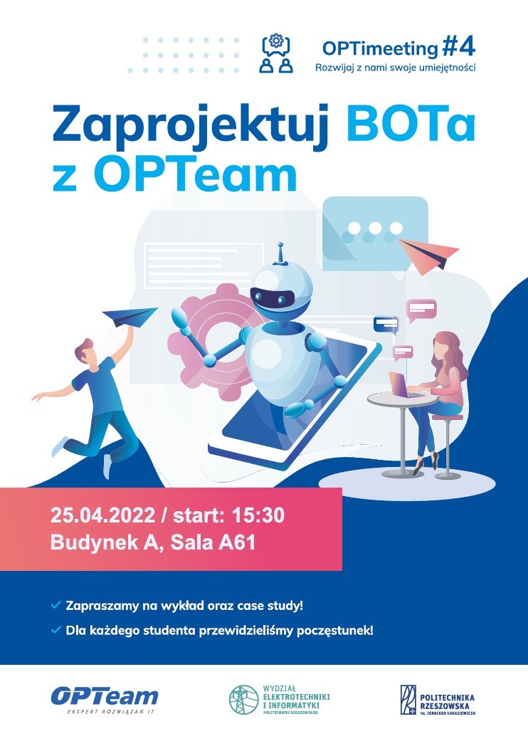 Podczas spotkania Lider Zespołu Programistycznego OPTeam S.A. opowie, jak działają współczesne BOTy konwersacyjne. Studenci poznają również przykładowe narzędzia pozwalające na ich budowę i zarządzanie nimi.