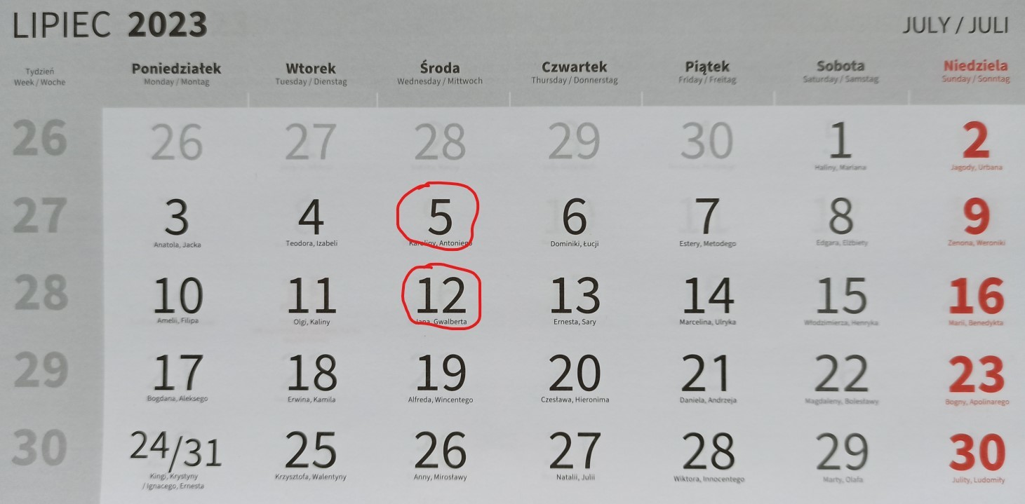 Kalendarz z zaznaczonymi terminami - lipiec 2023