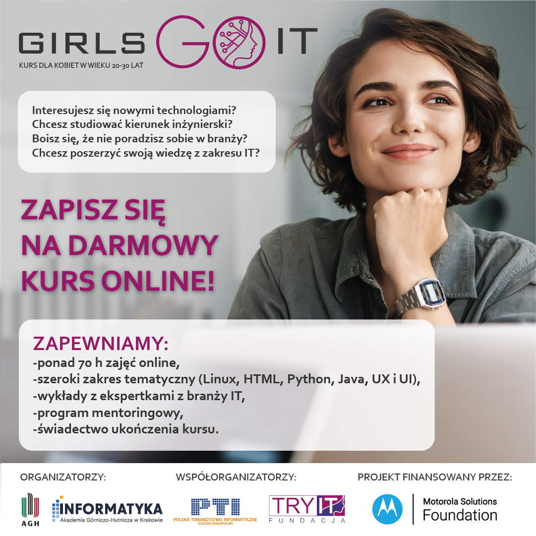 Zachęcamy do zapoznania się z bezpłatnym półrocznym kursem online „Girls Go IT” przeznaczonym dla kobiet w wieku 20-30 lat, które nie posiadają wykształcenia informatycznego. Kurs organizowany jest przez Wydział Informatyki AGH w Krakowie we współpracy z Fundacją Try IT. Więcej informacji znajduje się na załączonym plakacie oraz na stornie internetowej kursu (link do strony)